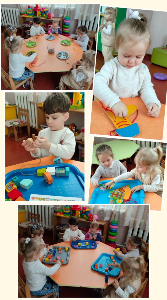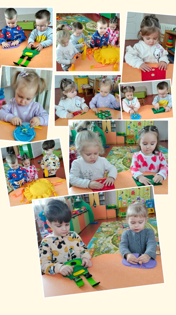 Діти вправлялися у протягуванні шнурків, застібанні ґудзиків, прикріплюванні деталей, нанизуванні елементів на мотузочку. Кожне завдання вимагало уважності, терпіння та координації рухів.